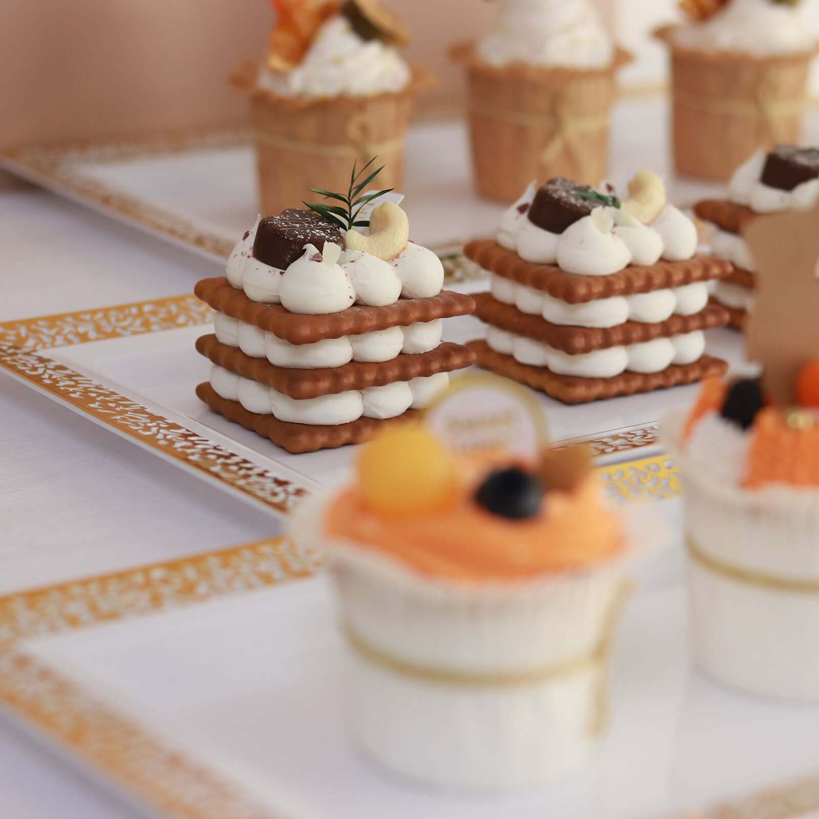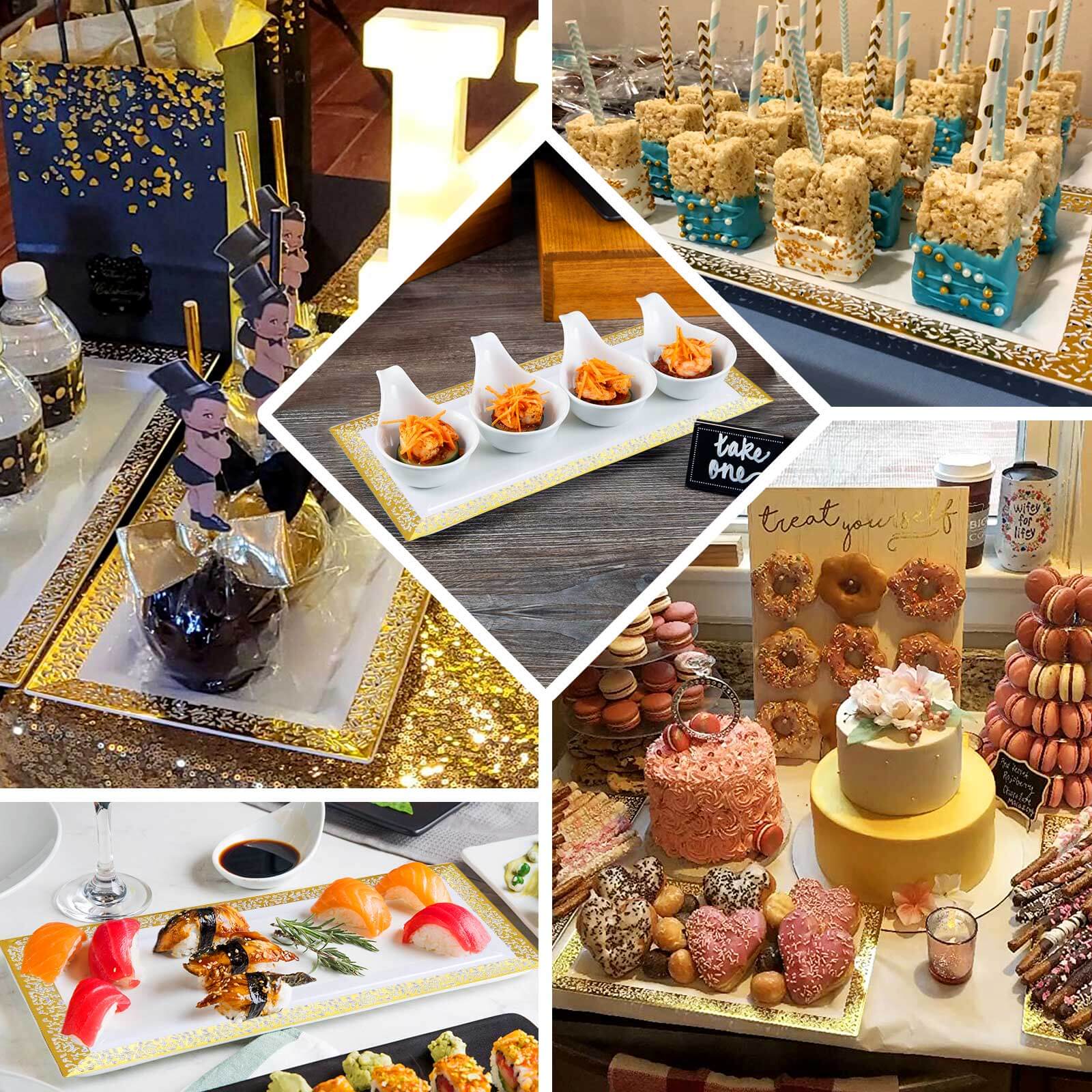 4-Pack Plastic 14" Rectangle Serving Trays White with Gold Lace Rim - Chic Decorative Table Tray Platters for Buffets Banquets Dinner Parties
